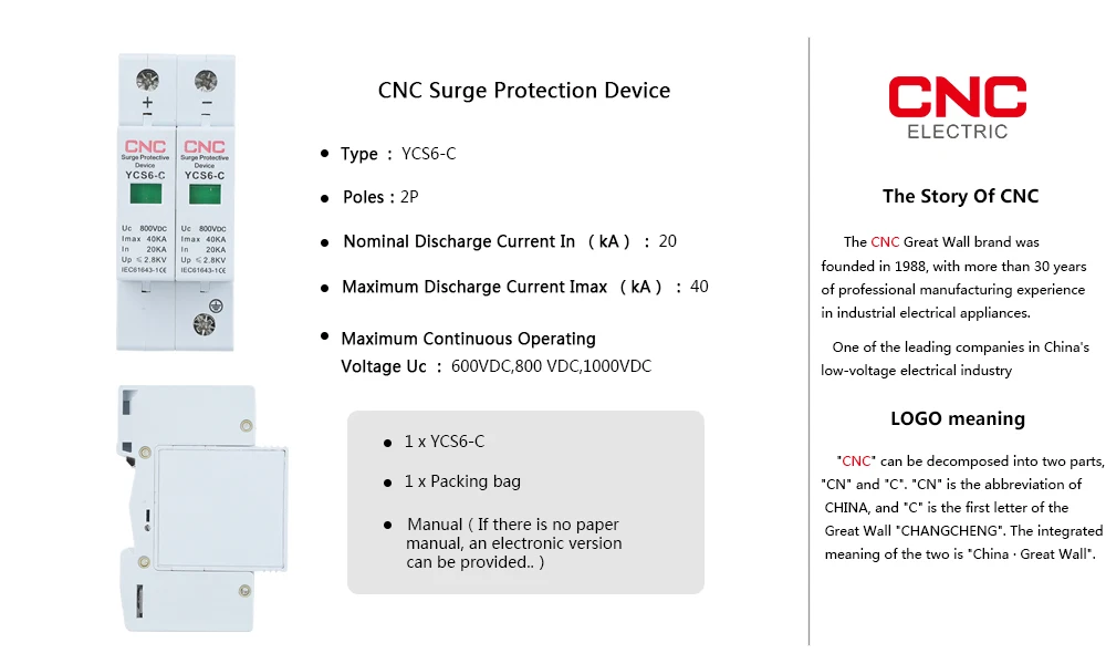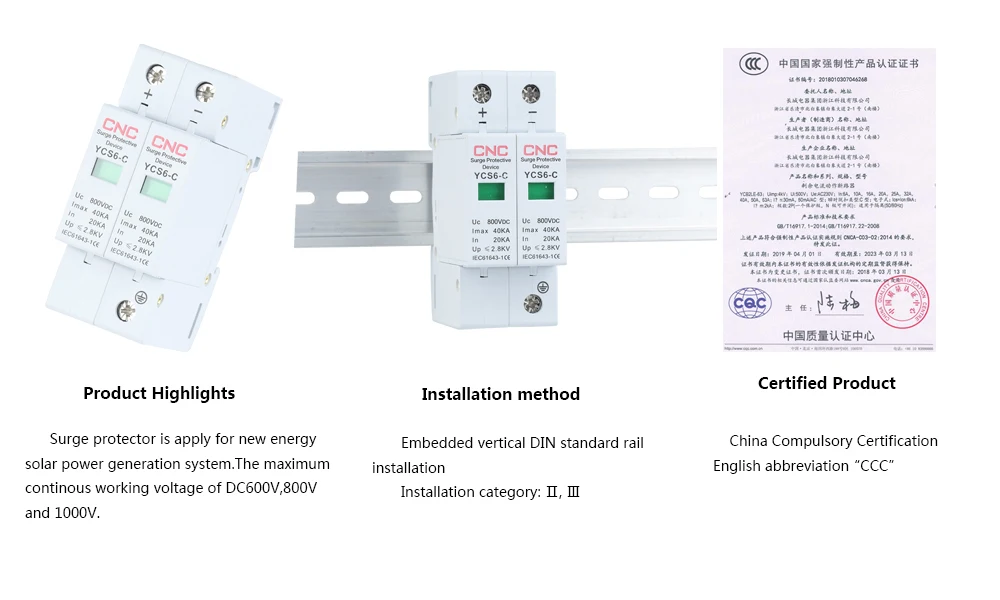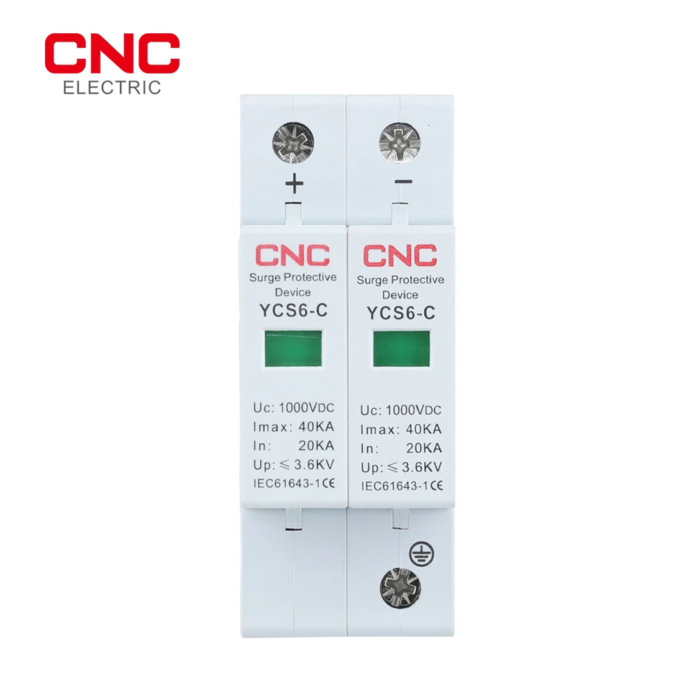 Type:YCS6-C DC Poles:2P Nominal Discharge Current In(kA):20 Maximum Discharge Current Imax(kA):40 Maximum Continuous Operating Voltage Uc :600VDC,800 VDC,1000VDC